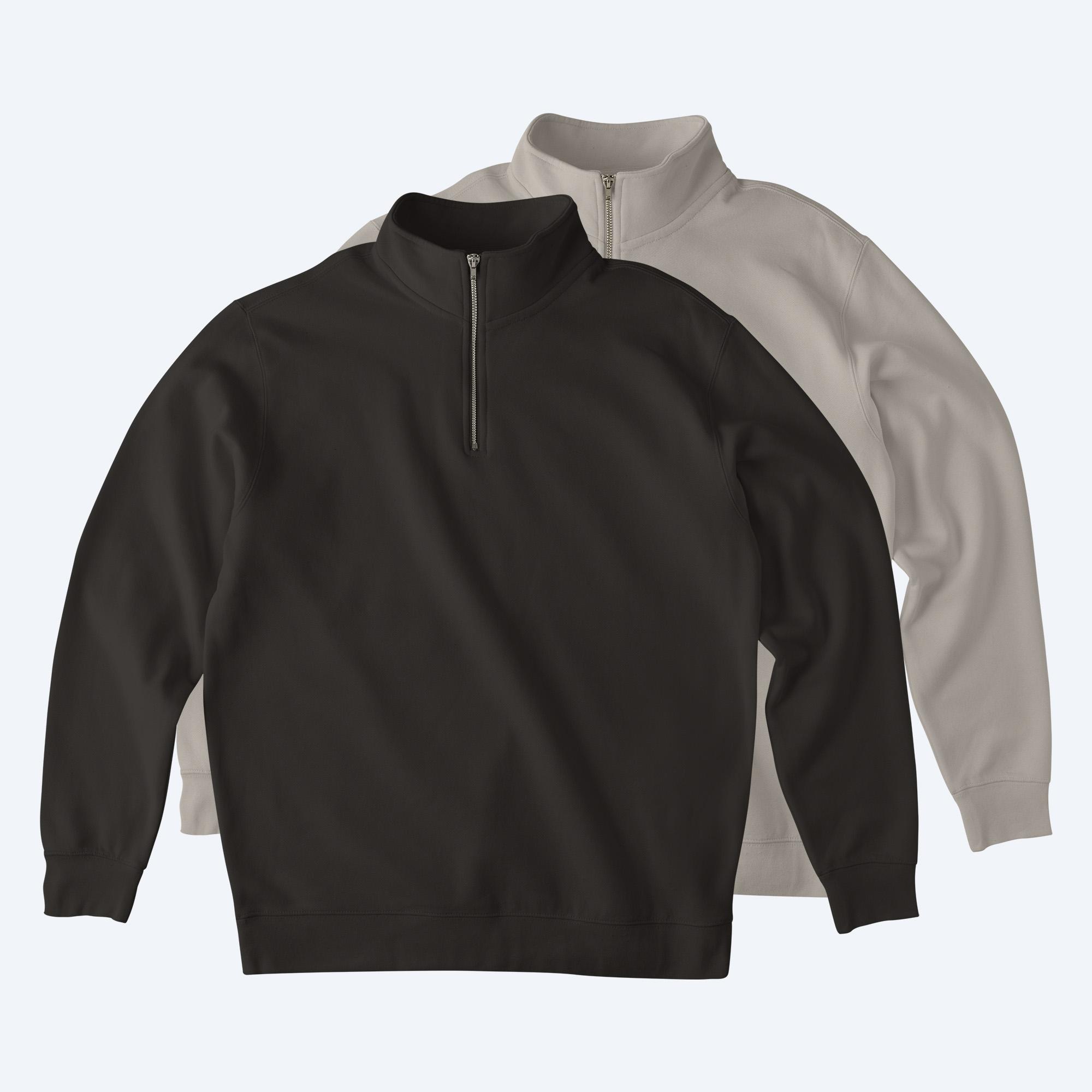 Two custom Midweight Quarter Zip Pullovers in black and sand beige, shown as a professional design service mockup for Fly Clothing Co in LA and NYC.Midweight Quarter Zip Pullover